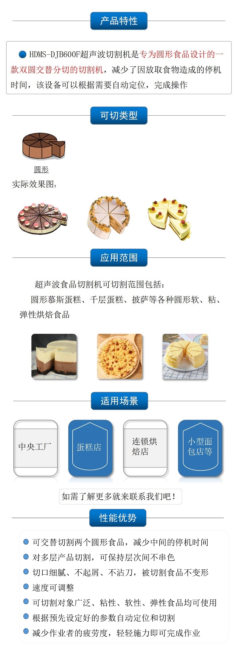 該設(shè)備配備單把超聲波刀片,可切圓形(只限一個(gè)圓蛋糕),也可切方形